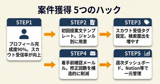 登録しても案件が来ないという悩みを持つ方は多くいます。以下の5つのハックを実践することで、登録後30日以内に初案件を獲得できる確率が大きく高まります。