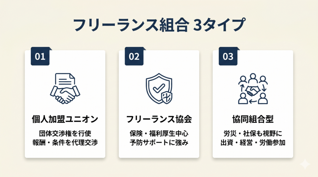 「フリーランスでも労働組合に入れるのか」と迷う方も多くいます。結論から言うと、加入できる組織は大きく3つのタイプに分けられます。