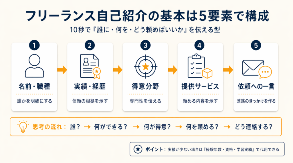 基本構成は①名前・職種・肩書き、②実績・経歴、③得意分野、④提供サービス、⑤メッセージの5要素です。この順番には理由があり、クライアントの「誰?→何ができる?→何が得意?→何を頼める?→どう連絡する?」という思考の流れに沿っています。