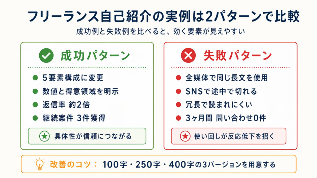 | 実際の成功・失敗例を見たい | フリーランス自己紹介の実例は2パターンで比較 | 5分 |