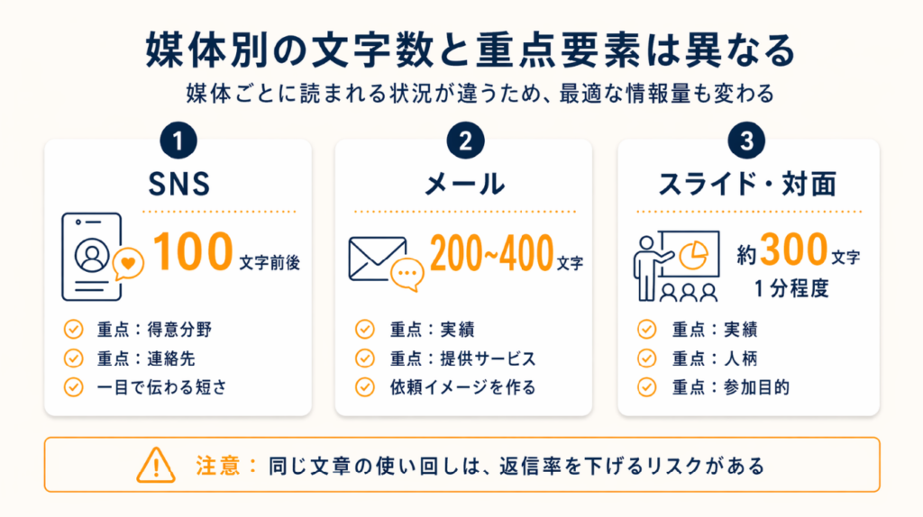 A: 媒体によります。メールでは200〜400文字、SNSでは100文字前後が読まれやすい適切な長さです。長さよりも「何を・どんな実績で・どう役立てるか」が伝わる構成の方が信頼獲得につながります。