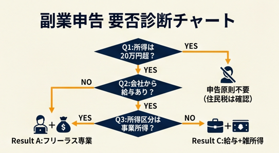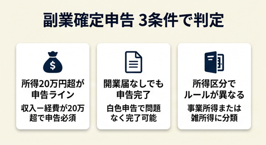 副業所得が20万円超であれば申告必須です。雑所得は損益通算の対象外のため、副業赤字があっても給与から差し引けません。