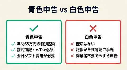 青色申告の大きなメリットは、正規の簿記(複式簿記)で記帳し、かつe-Taxによる電子申告または優良な電子帳簿保存を行うことで、年間65万円の特別控除が受けられる点です(freee会計「フリーランスの確定申告はいくらから?手続きに必要な書類ややり方について解説」)。青色申告と白色申告の違いや最適な選択方法についてはこちらで詳しく比較しています。