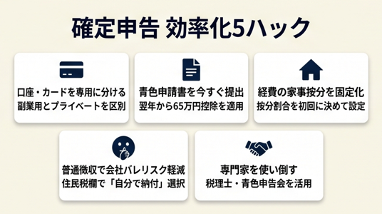 [なぜ効くのか]: 副業とプライベートの支出が混在すると、按分計算と仕訳の2段階の作業が毎回発生します。専用口座では「副業口座に入るものはすべて副業収入」と判断できるため、仕訳の判断コストがゼロになります。その結果、会計ソフトの自動連携がうまく機能し、年間の確定申告作業が初年度でも3〜4時間以内に収まる構造が生まれます。
