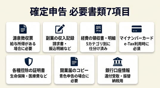 7項目すべてが揃ってから申告書作成に入ることで、途中で作業を止めずに一気に完了できます。1項目でも不足していると申告書作成の途中でストップするため、事前の準備完了が効率的です。