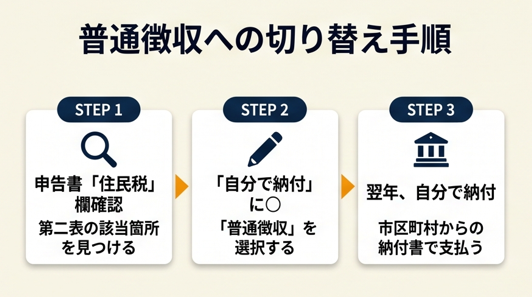 [コツ]: 「確定申告書を提出すれば自動で普通徴収になる」と考えがちですが、実際には「申告書内の住民税欄に○を入れなければ特別徴収(給与天引き)のまま」になります。この欄は見落としやすいため、申告書の最終確認で必ず確認してください。