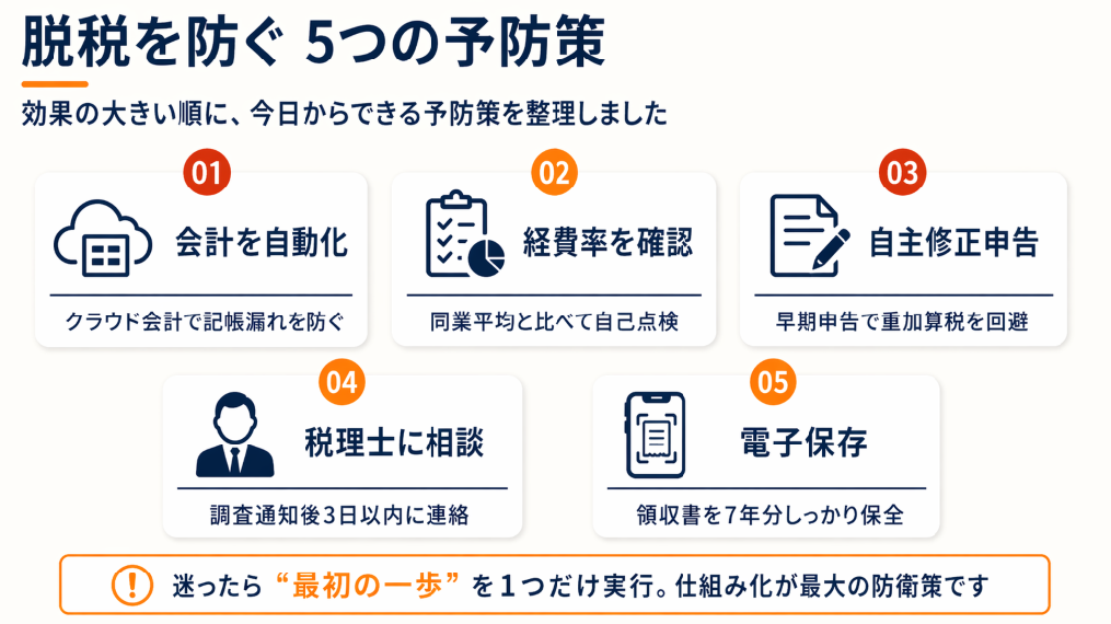 - [ポイント]: 「気づいた時点で自主申告する」ことを実行してください。税務署からの調査着手後は重加算税の適用が自動的に検討されます。自主申告であれば過少申告加算税の軽減特例(5%)が適用されるケースもあります。修正申告のやり方は「放置すると延滞税!?修正申告のやり方5ステップ」でe-Taxの手順を詳しく解説しています。