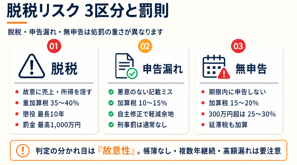 脱税・申告漏れ・無申告は法律上の扱いがまったく異なります。罰則の重さは行為の種類によって大きく変わるため、まず3種類を整理します。
