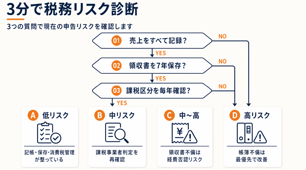 フリーランスが直面する税務リスクは大きく3区分に分けられます。