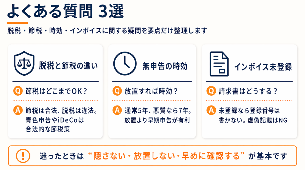 A: 節税は法律の範囲内で税負担を合法的に減らす行為です。青色申告特別控除(65万円)・小規模企業共済・iDeCoの活用などが代表例です。一方、脱税は売上を隠す・架空の経費を計上するなど法律に違反する行為です。合法的な節税策を活用することが、フリーランスの税負担を適正に管理する王道です。節税の全体像は「フリーランスの節税対策|税金額の計算・所得控除・ふるさと納税活用法まで解説」を参照してください。