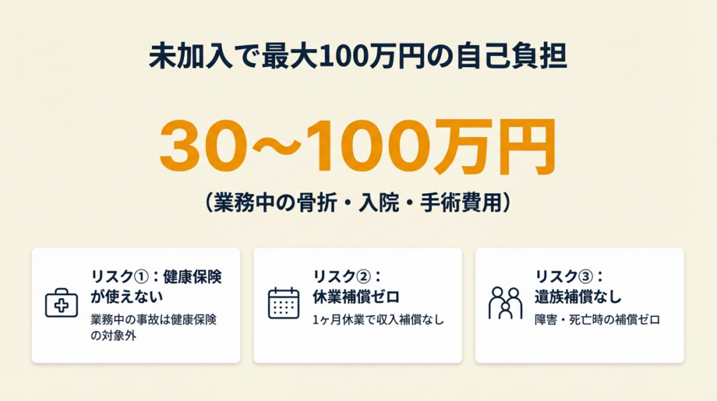 加入義務がない制度だからこそ、未加入のままでいるリスクを数値で把握しておく必要があります。業務中の事故が発生したとき、個人事業主には3つの補償の空白が生じます。