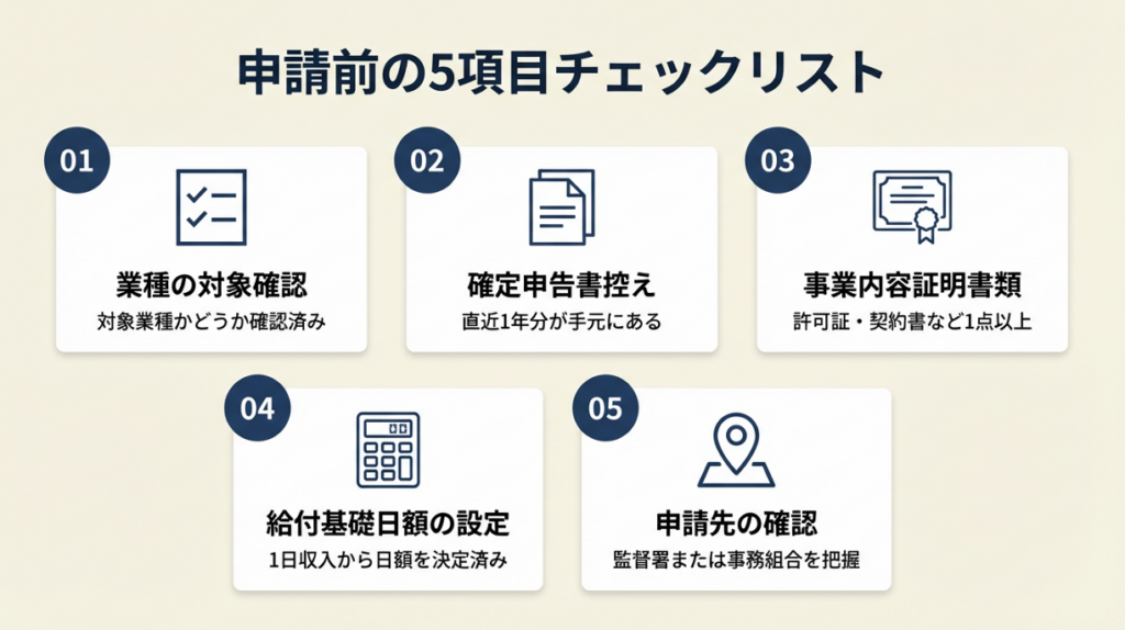 業種によっては追加書類が必要な場合があります。事前に監督署に確認した上で書類を揃えると、窓口での差し戻しを防げます。書類はコピーでOKなケースがほとんどですが、原本が必要な場合もあるため事前確認が欠かせません。確定申告書類の準備が初めての方は、フリーランスの確定申告ガイド(手続き・書類・控除)を先に参照してください。