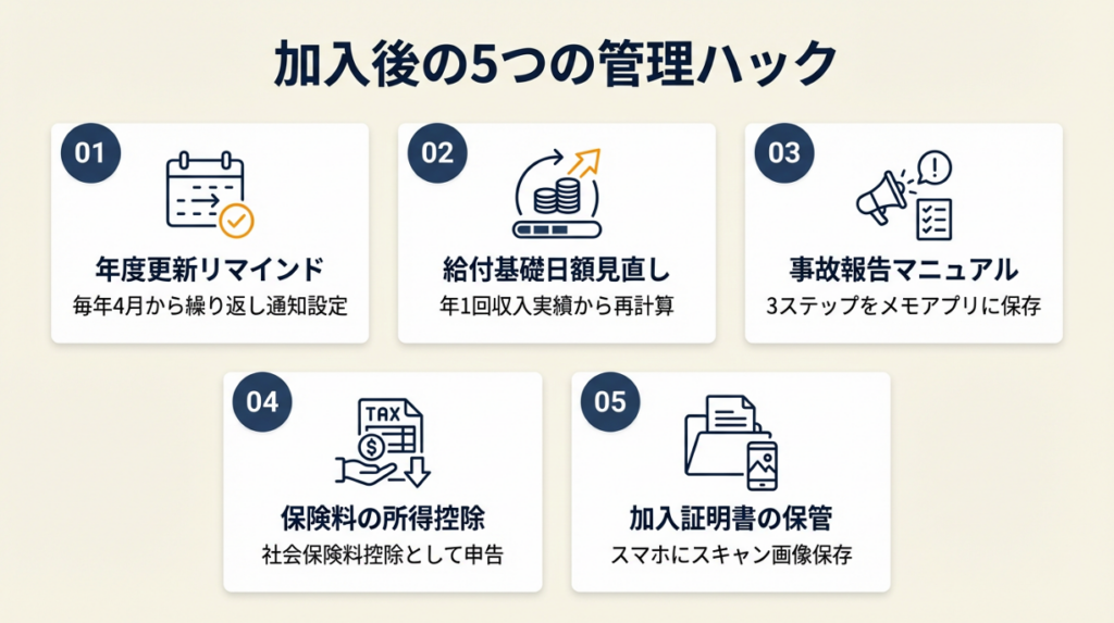 加入後は毎年6月1日〜7月10日の「年度更新」で賃金申告と保険料の精算を行います。この年度更新を忘れると補償が失効するため、スマートフォンのカレンダーに毎年リマインドを設定してください。