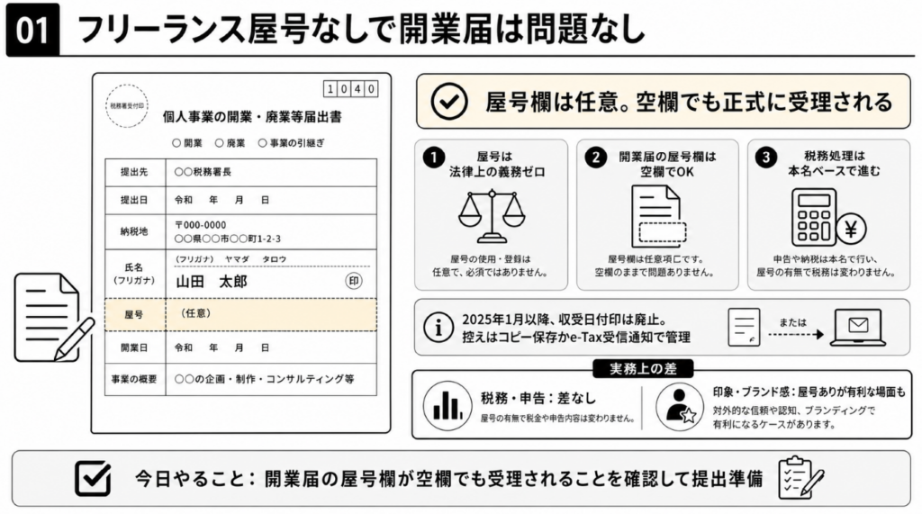 副業からフリーランスを始める場合も同様で、副業フリーランスの始め方では屋号なしでの活動実例が多数紹介されています。