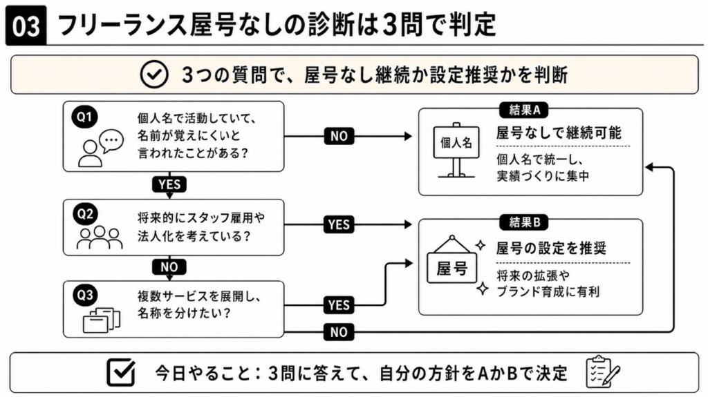 屋号を設定すべきか、このまま個人名で活動すべきか迷う方もいます。以下の3問で自分の状況を診断してみてください。