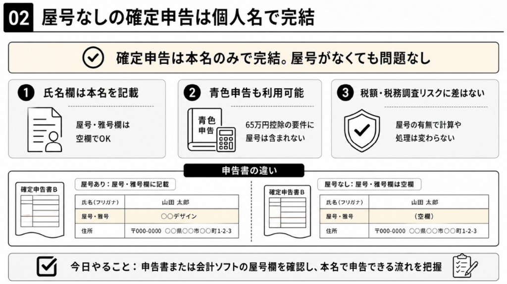 屋号あり・なしの申告書の違いは「屋号・雅号」欄の記載有無のみです。収入・経費・所得の計算フローはまったく同一であり、税務調査のリスクや税額が屋号の有無によって変わることもありません。