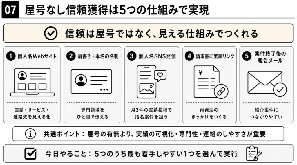 屋号がないと「信頼を得にくい」と感じる方もいます。ただし、屋号なしでも信頼を構築するための仕組みは5つあります。