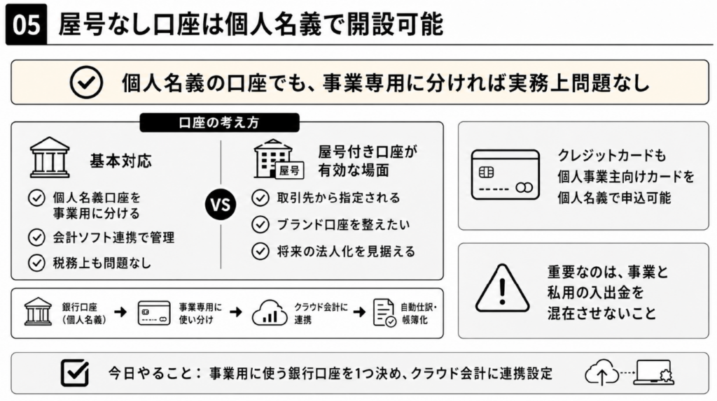 | 口座・クレカの扱いを確認したい | 屋号なし口座は個人名義で開設可能 | 3分 |