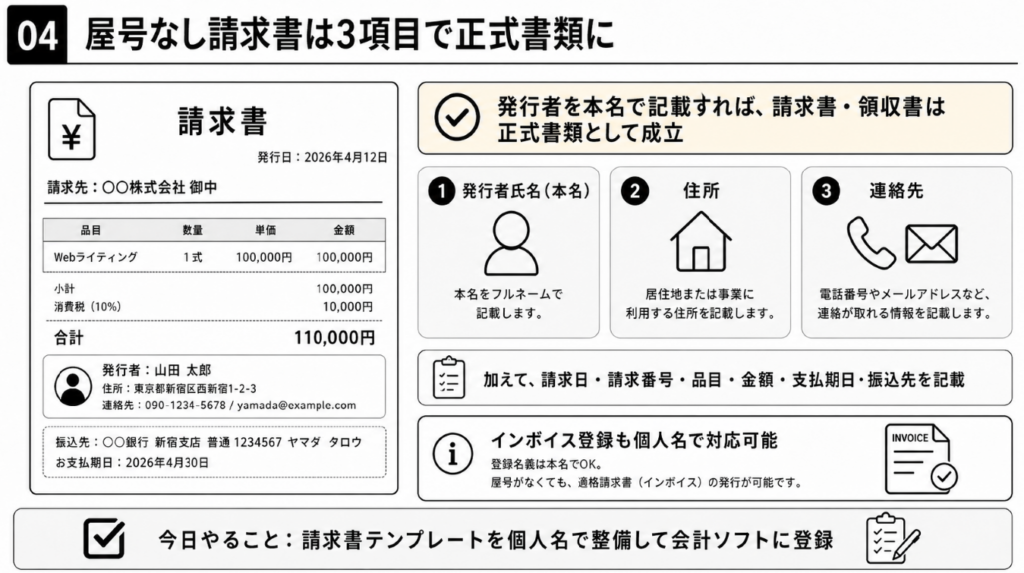 自分の開業届(または開業予定の書類)の屋号欄を確認し、空欄でも問題ないことを把握したうえで、請求書の発行フォーマットを個人名で整備する(30分)。