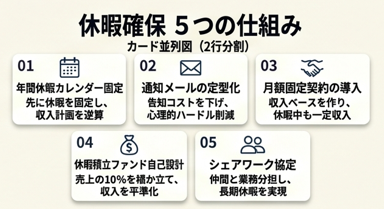 月額固定型契約の導入や案件の多様化を先に行い、収入ベースが安定してから休暇計画を立ててください。収入安定化の具体策については、その働き方、本当に得してる?年収で見るフリーランス判断軸も参考になります。
