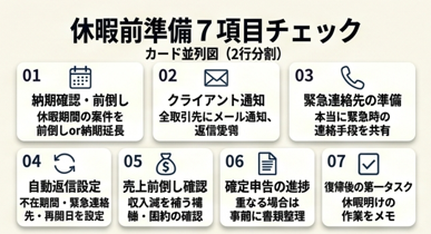 7項目すべてにチェックが入れば、安心して休暇に入れる状態です。チェックが3つ以下の場合は、まず「クライアント通知」と「納期確認」の2項目を先に完了させてください。