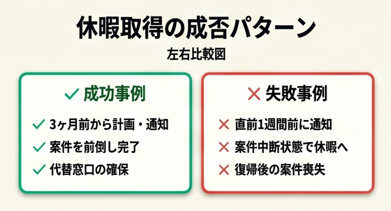 もし休暇1ヶ月前から段階的にクライアントへ通知し、進行案件を完了させてから休んでいれば、案件の喪失は防げた可能性があります。