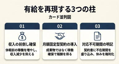 顧問契約・月額保守契約・コンサルティング定額契約など、成果物ではなく「稼働の確保」に対して報酬が支払われる契約形態を取り入れることで、休暇中も一定収入を維持できます。例えば月3万円の顧問契約を3社と結べば、月9万円の固定収入ベースが生まれます。