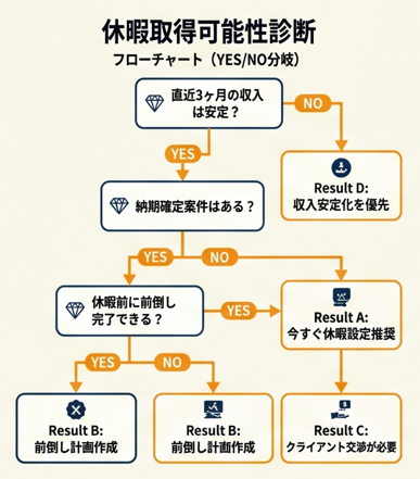 「今の自分は休暇を取れる状態なのか?」と迷う方も多くいます。以下のフローで現在の休暇取得可能性を判定できます。
