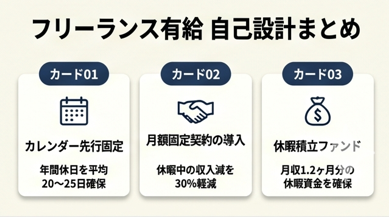 フリーランスに法定の有給休暇はありませんが、年間カレンダーの先行固定・月額固定契約の導入・休暇積立ファンドの3つの仕組みを組み合わせれば、会社員に近い休暇体験を自分で設計できます。