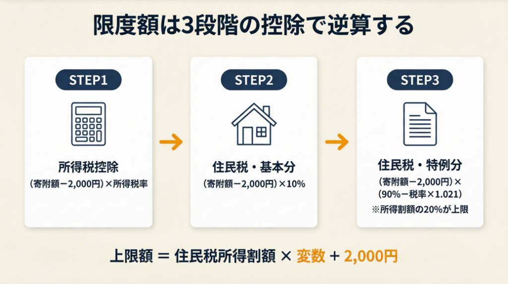 3段階の控除を合計して「2,000円だけ自己負担」となる寄附上限額を逆算した計算式が、さとふるやマネーフォワードが採用する実務的な計算式です(さとふる 自営業者の控除上限額)。