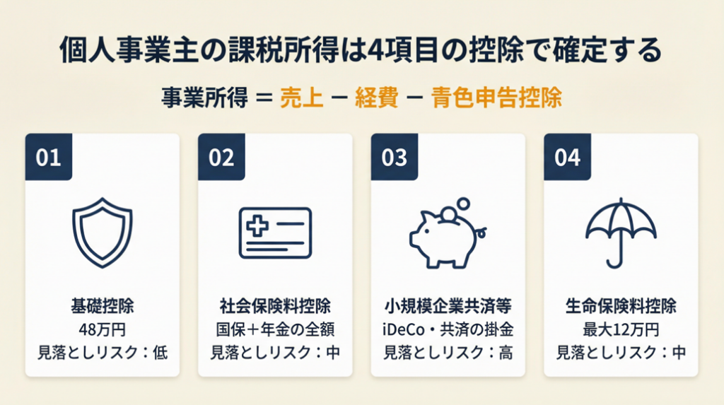 課税所得は事業所得から各種所得控除を差し引いた金額です。個人事業主が見落としがちな主な控除は以下の4項目です。