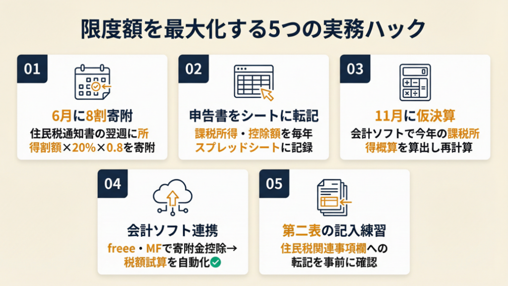 - 住民税所得割額 × 20% × 0.8(安全係数)を「今年の仮上限額」として手帳またはスマホのメモに記録する(3分)