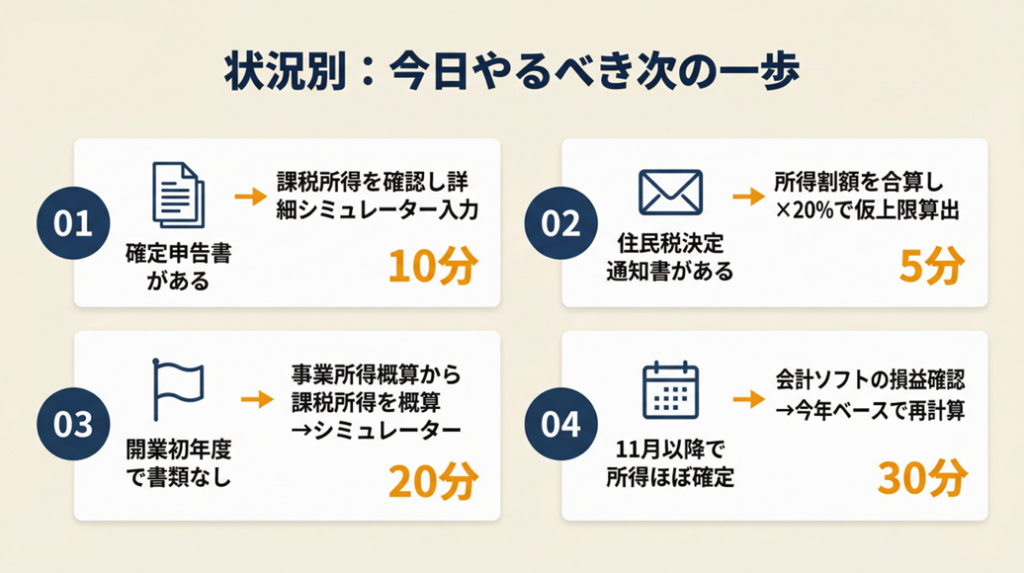 | 住民税決定通知書がある | 所得割額(市区町村+道府県)を合算→×20%で仮上限算出 | 5分 |