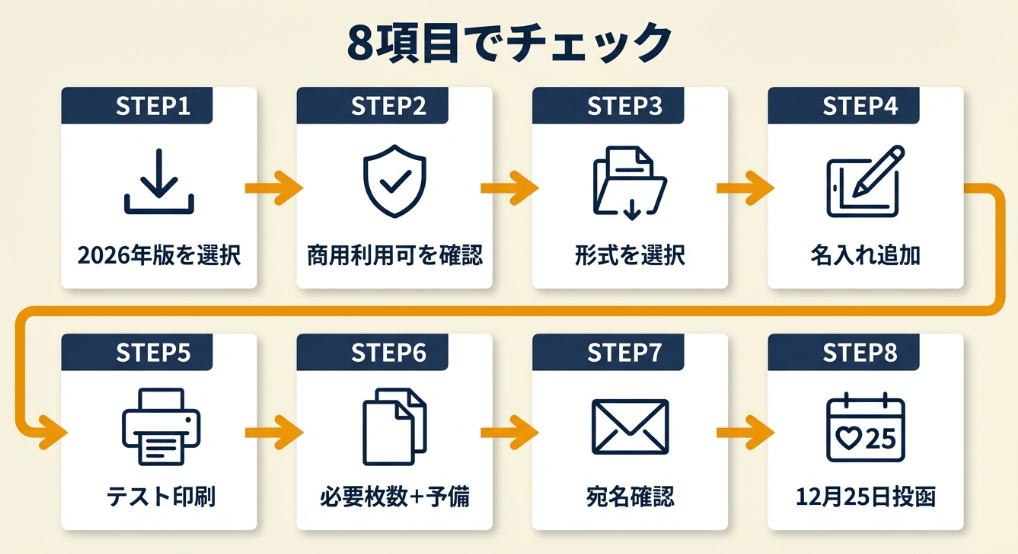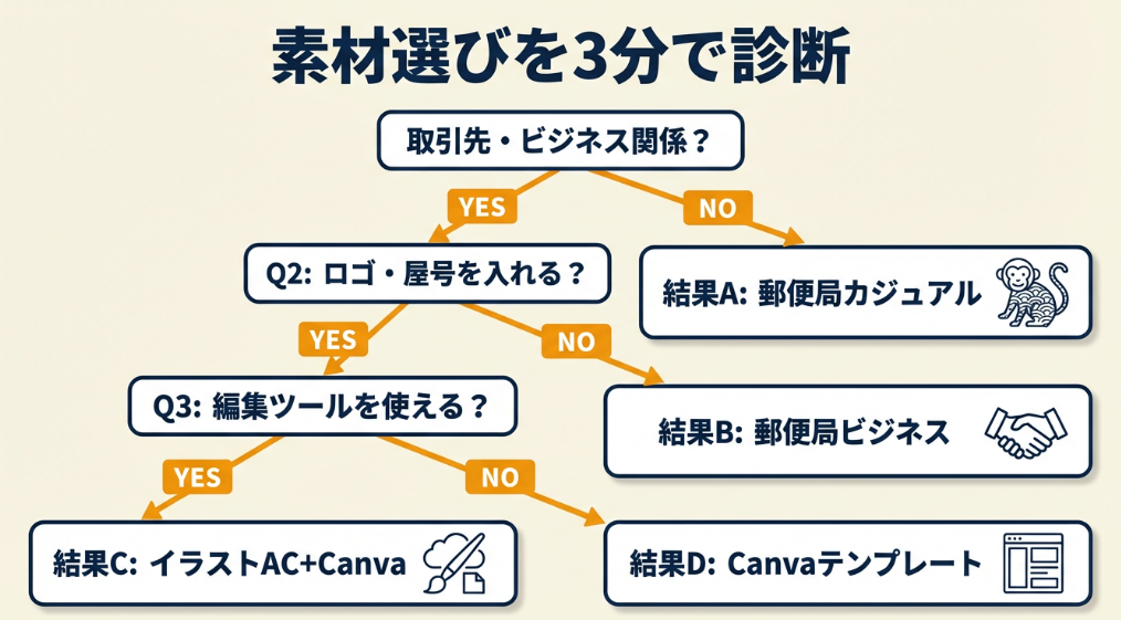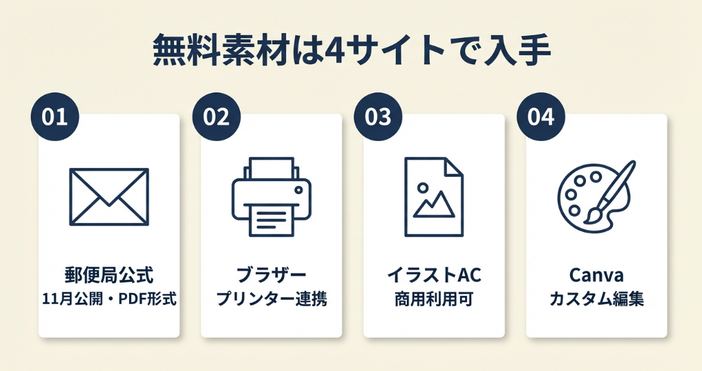 郵便局公式・ブラザー・イラストAC・Canvaの4サイトを押さえれば、2026年版の高品質テンプレートが10分以内に手に入ります。フリーランス・個人事業主は商用利用可の素材を選び、名入れやロゴ追加で差別化するのが最短ルートです。素材選びに迷う時間を減らし、年内発送のスケジュールに集中してください。