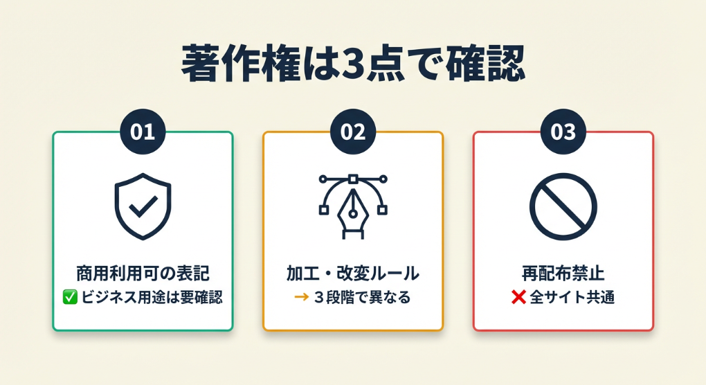 無料素材でもすべて自由に使えるわけではありません。取引先へ送る年賀状に使う場合、著作権の確認は3つのポイントに絞れます。フリーランスが受発注時の契約で著作権条項を確認するのと同じ感覚で対応してください。