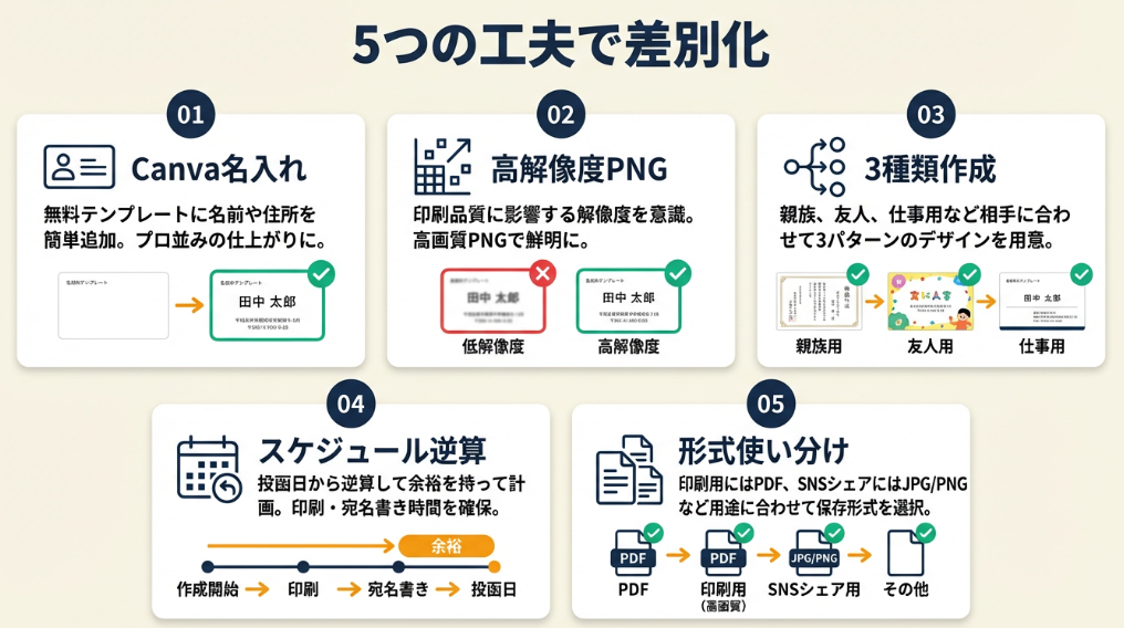 判断: 郵便局の公式テンプレートをベースに、Canva無料版で屋号と連絡先を追加。デザインの統一感を意識した。