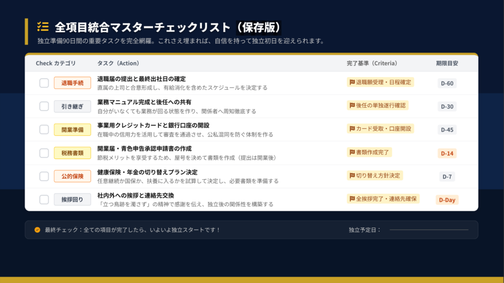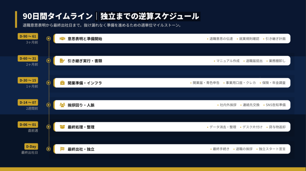 | 退職手続き | 意思表明、退職届提出、有給消化 | D-90〜D-0 | 最初に着手すべき軸 |