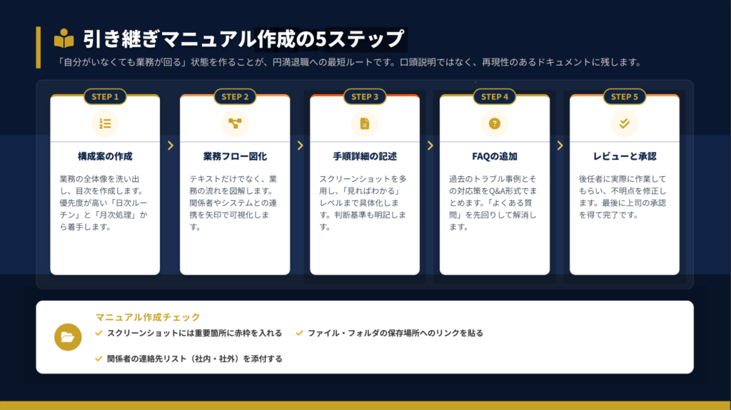 マニュアル作成は「構成案の作成→業務フロー図化→手順詳細の記述→FAQの追加→レビューと承認」の5段階で進めます。スクリーンショットには重要箇所に赤枠を入れ、ファイル・フォルダの保存場所へのリンクを貼り、関係者の連絡先リスト(社内・社外)を添付することがポイントです。