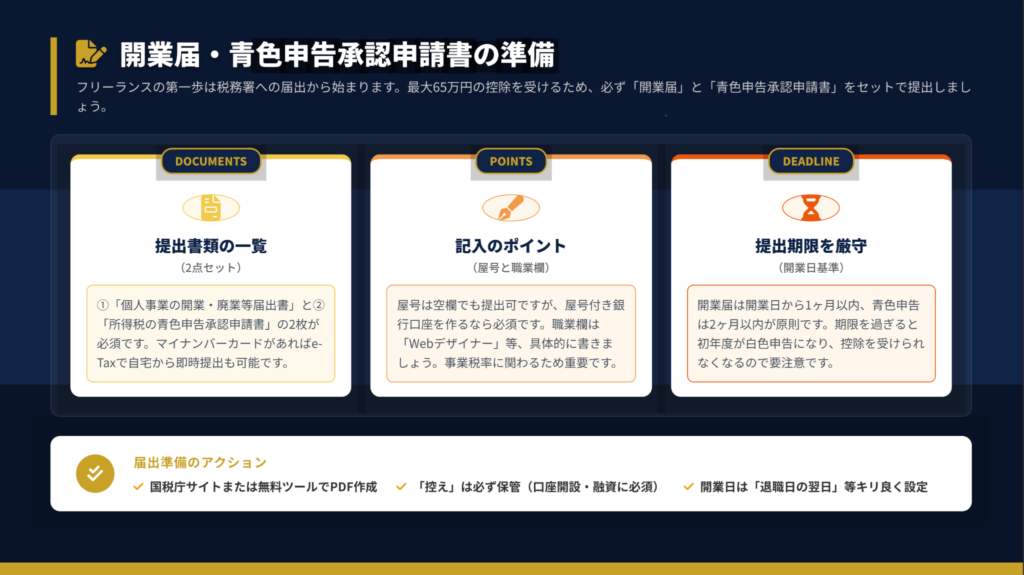 フリーランスの第一歩は税務署への届出から始まります。最大65万円の控除を受けるため、必ず「開業届」と「青色申告承認申請書」をセットで提出してください。