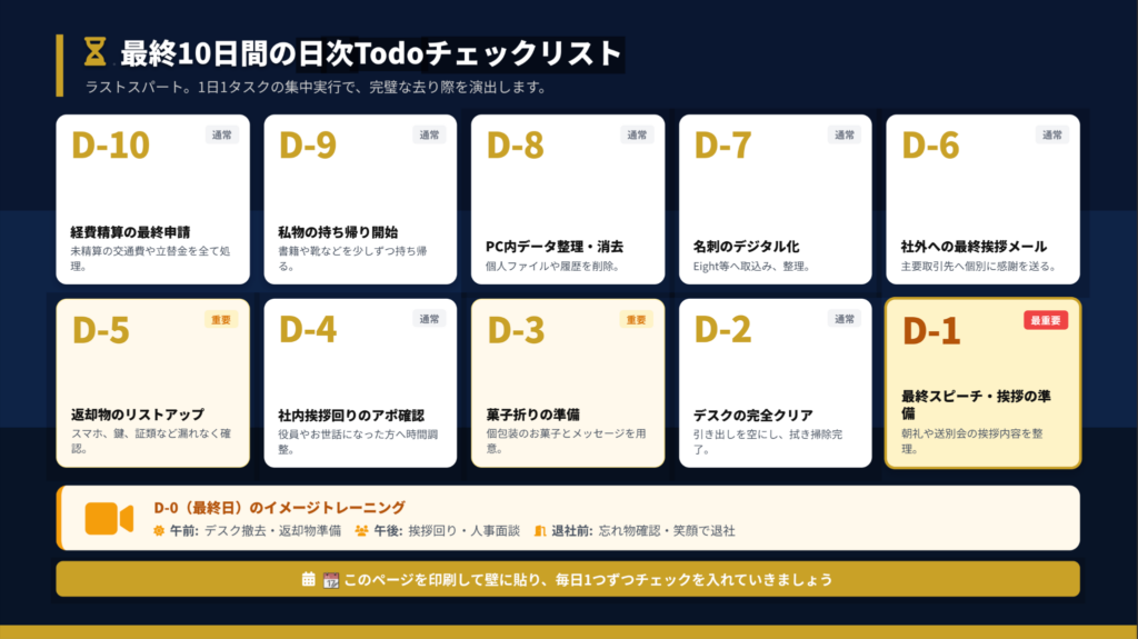 | D-1 | 最終スピーチ・挨拶の準備 | 最重要 | 朝礼や送別会の挨拶内容を整理 |