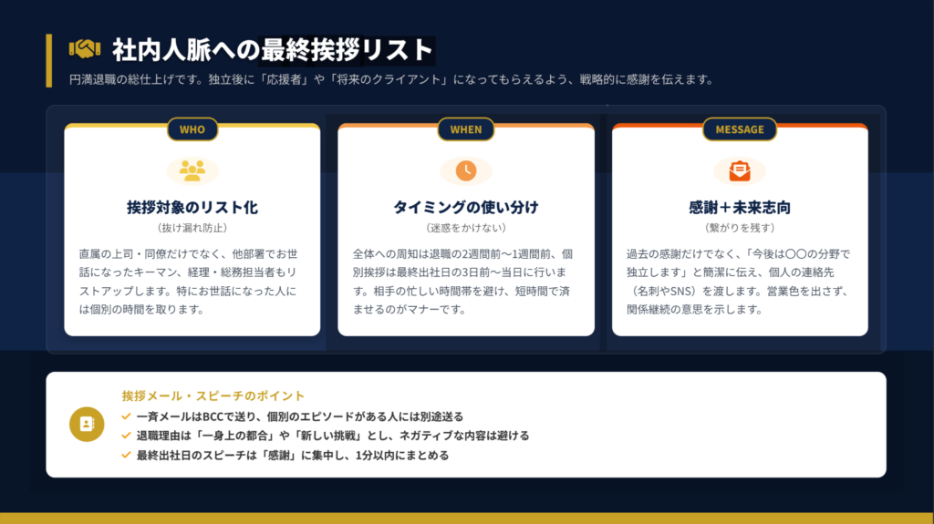 直属の上司・同僚だけでなく、他部署でお世話になったキーマンや経理・総務担当者もリストアップしてください。全体への周知は退職の2週間前〜1週間前、個別挨拶は最終出社日の3日前〜当日に行います。