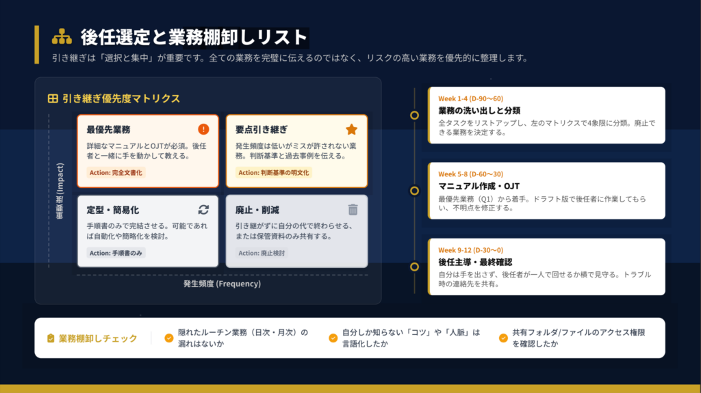 | 最優先業務 | 重要度高・頻度高 | 詳細マニュアル+OJT必須 | 後任者と一緒に手を動かして教える |