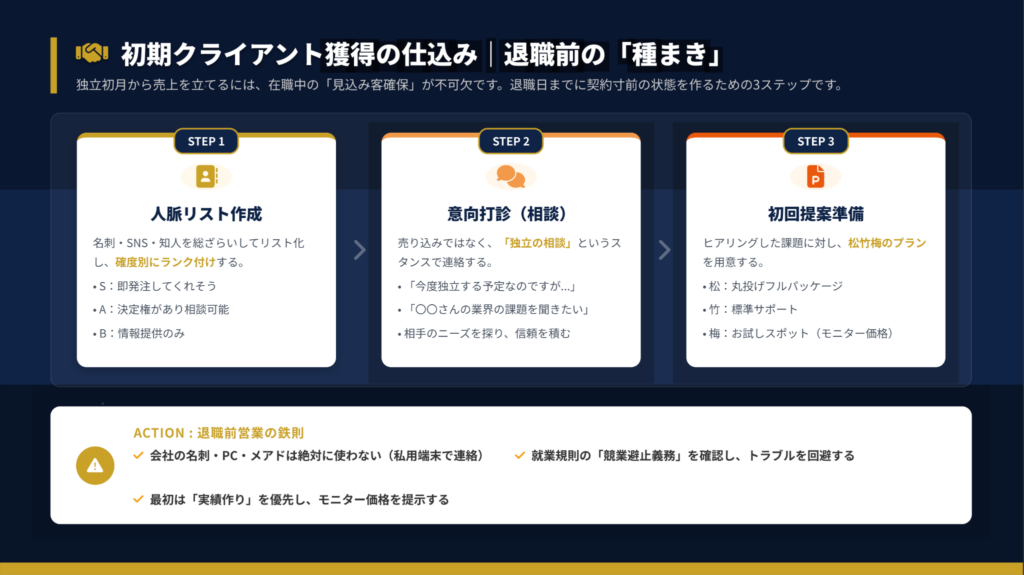 | 独立初月の売上確保が不安 | 独立準備の初月売上は3段階で仕込む |