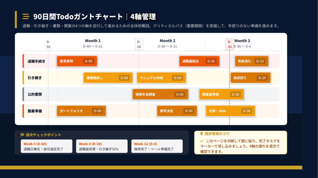 週次チェックポイントとして、Week 4(D-60)で退職日確定と後任選定完了、Week 8(D-30)で退職届受理と引き継ぎ50%完了、Week 12(D-0)で挨拶完了とツール準備完了を目標にしましょう。