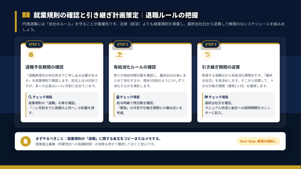 就業規則の「退職」に関する条文をコピーまたはメモしてください。民法上は14日前ですが、多くの企業は1〜3ヶ月前と定めています。「○ヶ月前までに直属の上司へ」という記載を探し、競業避止義務(同業他社への転職制限)の有無も併せて確認しておくと安心です。