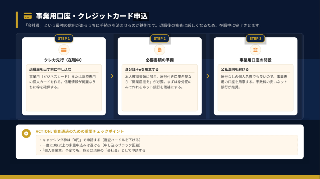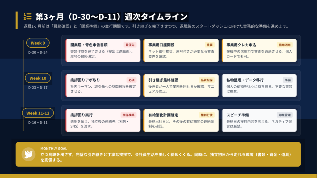 | Week 9(D-30〜24) | 開業届・青色申告書類 | 事業用口座開設 | 事業用クレカ申込 |