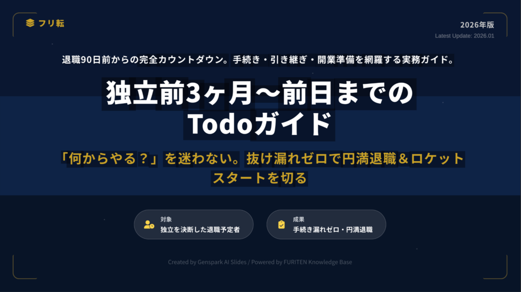 本記事は「独立前3ヶ月〜前日までのTodoガイド」の内容を元に作成しています。 より詳しい図解・チェックリスト・計算シートは、以下からダウンロードできます。