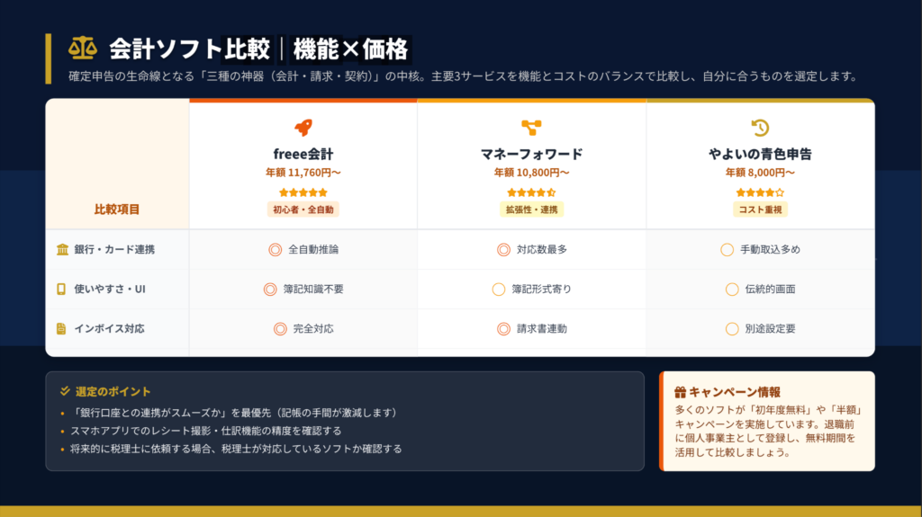 確定申告の生命線となる会計ソフトは、退職前に選定しておきましょう。主要3サービスを機能とコストのバランスで比較します。