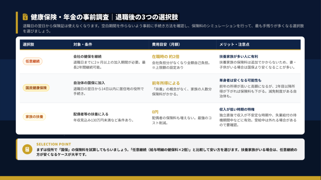 退職日の翌日から保険証は使えなくなります。空白期間を作らないよう、事前に3つの選択肢を比較検討してください。