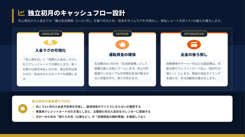 多くの取引は翌月末払いのため、独立初月は収入ゼロ・支出のみとなるリスクを認識しておいてください。向こう3ヶ月の入出金予定表を作成し、最低残高がマイナスにならないか確認することが重要です。